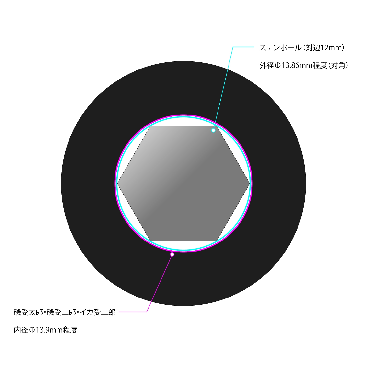 "Stainless Pole" is hexagonal with an opposite side of 12 mm and a diagonal of 13.86 mm, so we have rounded up the fractions and wrote "Compatible with other rod holders with internal dimensions of 14 mm or more''.